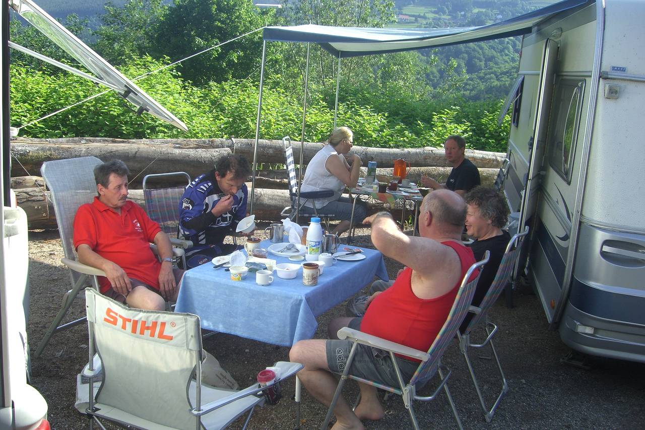 Um 19h gab es dann im Gemeindesaal Choucroute von Michel Petitdemange zubereitet. Leider keinen Rotwein, dafür weissen Riesling. Der Abend war sehr gesellig und um ca 23h ging es dann zur Nachtruhe ins Auto. Zum Glück hatte ich unter dem Schiebedach ein Mückennetz montiert. So schlief sich bis morgen um 7h durch. Bald wurden wir dann vom Team-Kapitän Annemarie zum Frühstückstisch gerufen. Martin Feidt brachte sogar 20 frische Croissances mit Stampfli Confi und Kaffee...mmmh, der Tage begann ja hervorragend und das bei voller Morgensonne.