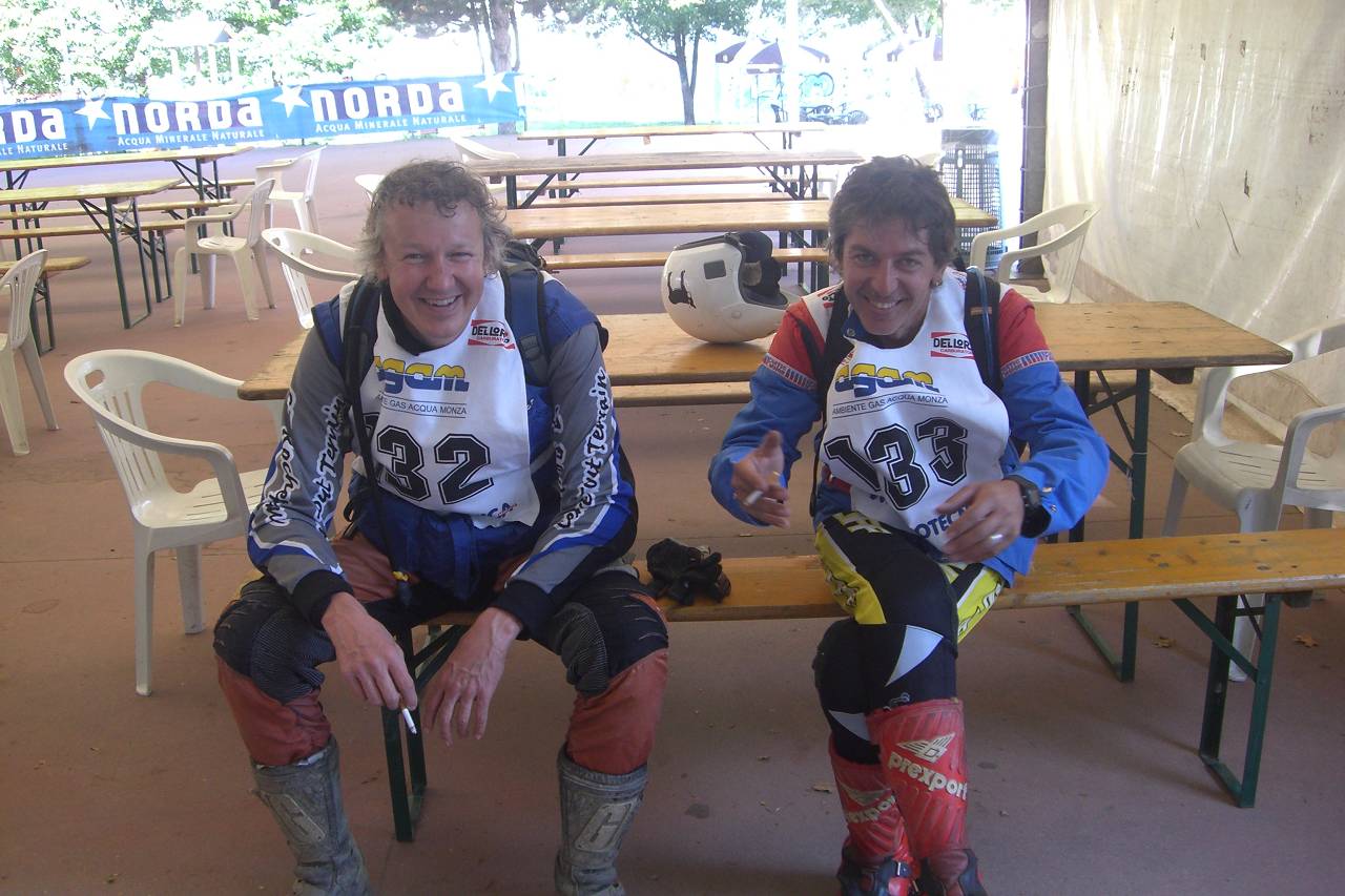 Via Splügenpass fahre ich am Samstag abend in 3.5 Std an den Lago di Como. Zum Eindunkeln erreiche ich um ca 20h den Parkplatz, finde aber nur ein paar Dellorto Banderolen und einen Berner Buss mit Trialmotos drin. Per Telefon finde ich dann Ralph Kunz und seinen Freund Thomas "Tömou", beide aus Thun. Zum gemeinsamen gemütlichen Abendessen al Fresco (draussen, aber doch windgeschützt) genehmigen wir uns natürlich ein oder zwei Biccere di vino rosso. Ich kriech um 24h in meinen Volvo und schlafe bis um 7h. Dann wecken mich die ersten Knattertöne einer Fantic. Die Kollegen vom Moto Club Monza sind da und stellen alles auf. Fahrerlager und Start ist neben dem grossen Kinderspielpark unter einem grossen Zelt.