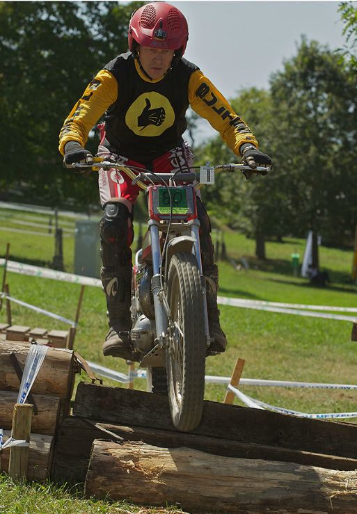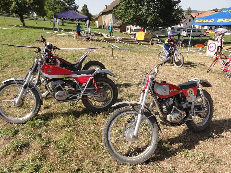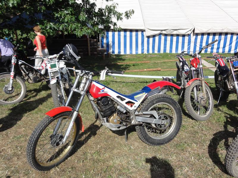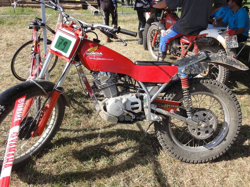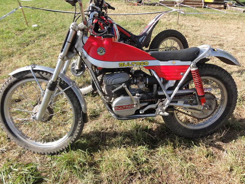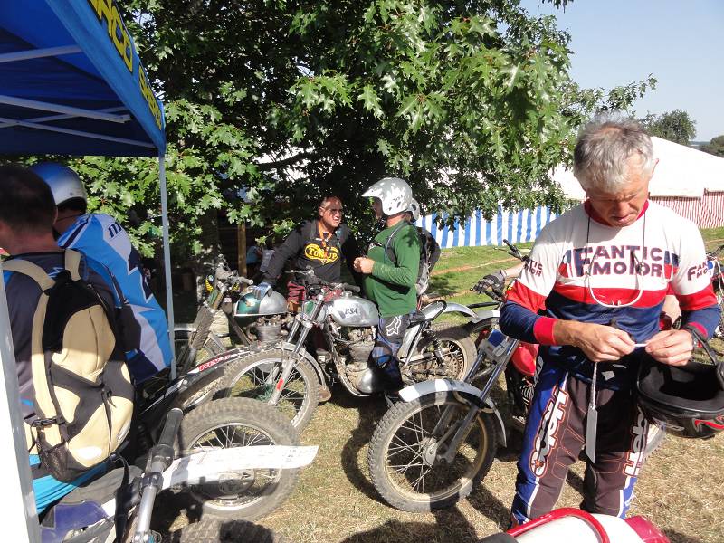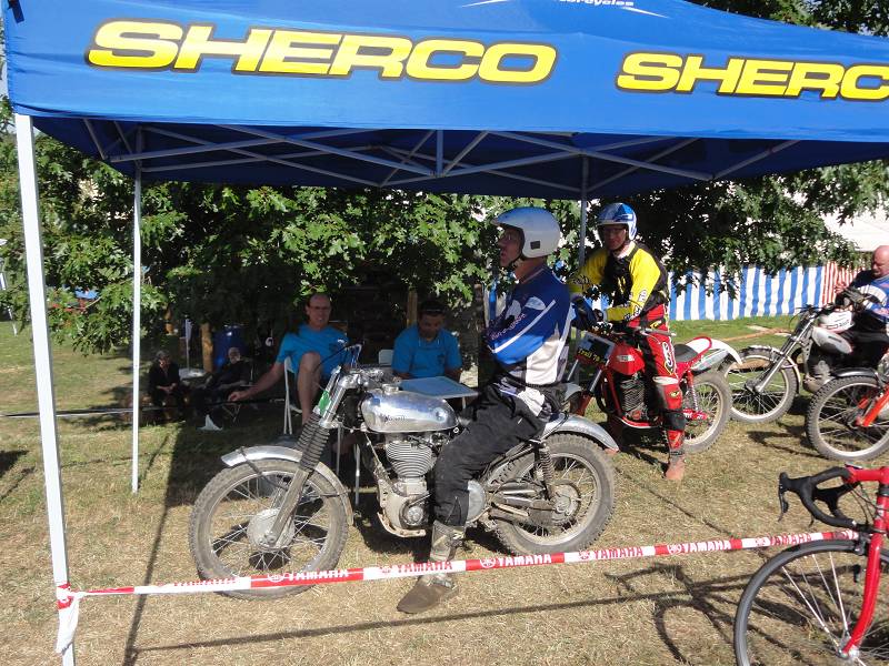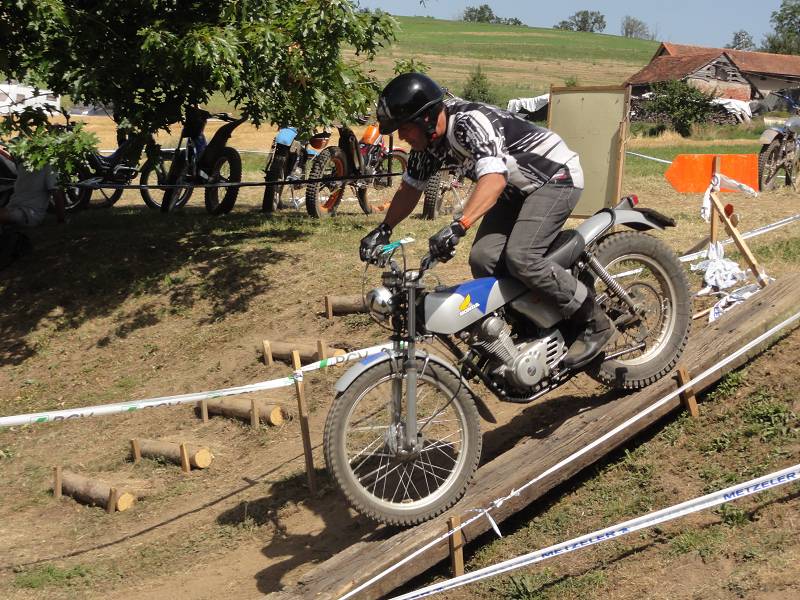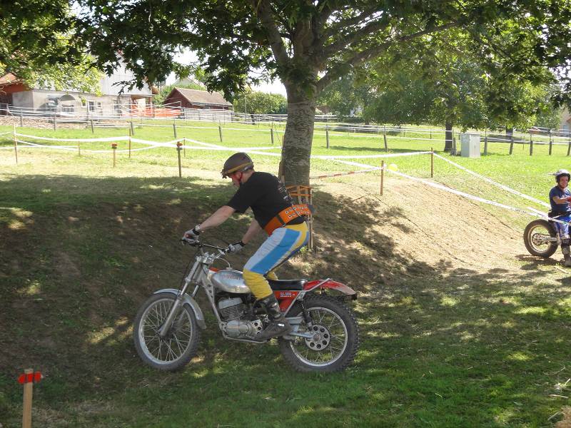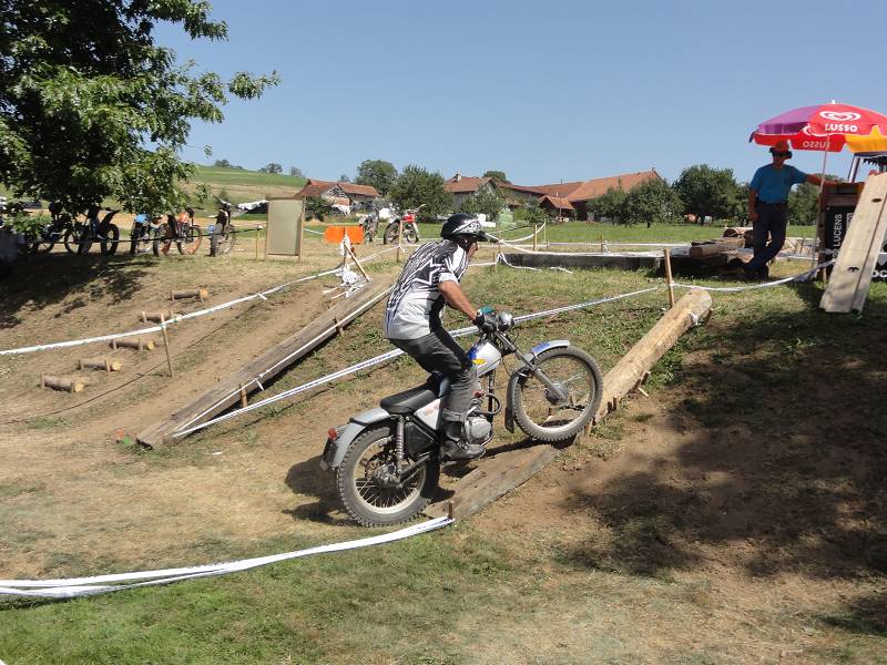 Die Sektionen sind heute etwas schwerer, oder liegt es am Rotwein? Die 4 über den Steinhaufen ist schon knifflig und die 6 im Waldbach hat es in sich, muss man doch heute ganz hoch. Man hat zwei Möglichkeiten, links über eine Felsplatte (wie gut greift die?) oder links über Wurzeln. Ich möcht eigentlich links, aber die Bulto fährt rechts und mit letztem Gripp rette ich mich mit einer 3 hoch. Die Hitze macht schon zu schaffen, aber zum Glück sind viele Sektionen im Wald und auf der Zwischenstrecke kühlt der Fahrtwind etwas. Meine neuen Betor Federbeine (36cm) von Sammy Miller Products (150£) kann ich nur empfehlen, viel besser als die alten, harten Betors. Auch der neue Oko-Vergaser funktioniert zuverlässig, der Motor stellt nie mehr ab, ein Novum.