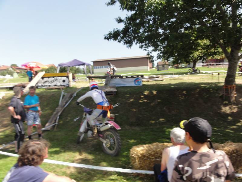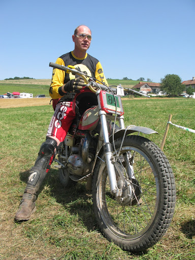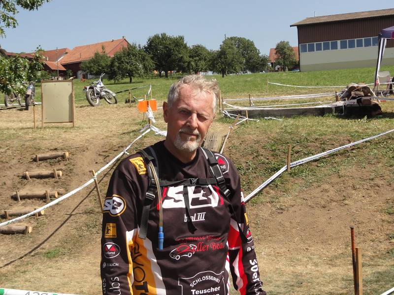 Wie immer gibt es eine Fun-Sektion. Diesmal wurde eine Art rollbare Hofhundleine an einen Baum befestigt, das andere Ende an einem Klettergestätli am Fahrer. Das Knifflige war, dass der Rollmechanismus bei zu schneller Bewegung plötzlich klemmte, wie ein Autogurt, somit musste man ganz langsam mit schleiffender Kupplung ein Bord hoch, Kurve, dann wieder alles retour. Klappte bei mir, aber manchmal schien die Rolle zu spucken, was den Fahrer aus dem Sattel hben konnte, zur allgemeinen Belustigung der Zuschauer und Schmerz des Fahrers. Anscheindend ist dies leider genau Beat widerfahren, mit harter Landung auf die Schuler. Schmerzen liessen das Rufen der Sanität opportun werden. Der arme Beat wurde nach Lausanne gefahren, wo Bänderriss in der Schulter prognostiziert wurde. Zum Glück konnte mit Christian Weber ein Chauffeur für die Heimfahrt von Beats Auto organisiert werden. Zwei Tage später wurde dann in Zürich die Schulter operiert. Gute Genesung wünschen wir. Immerhin wurde Beat 14. von 28.