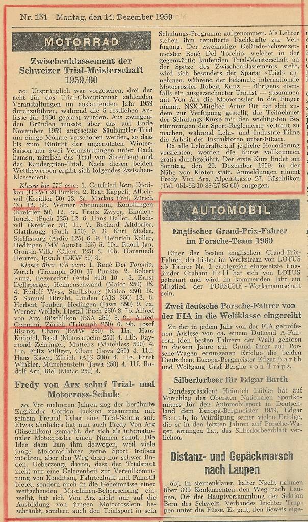 CH Meisterschaft Trial 1959 / 60 Zwischenstand Dezember 1959